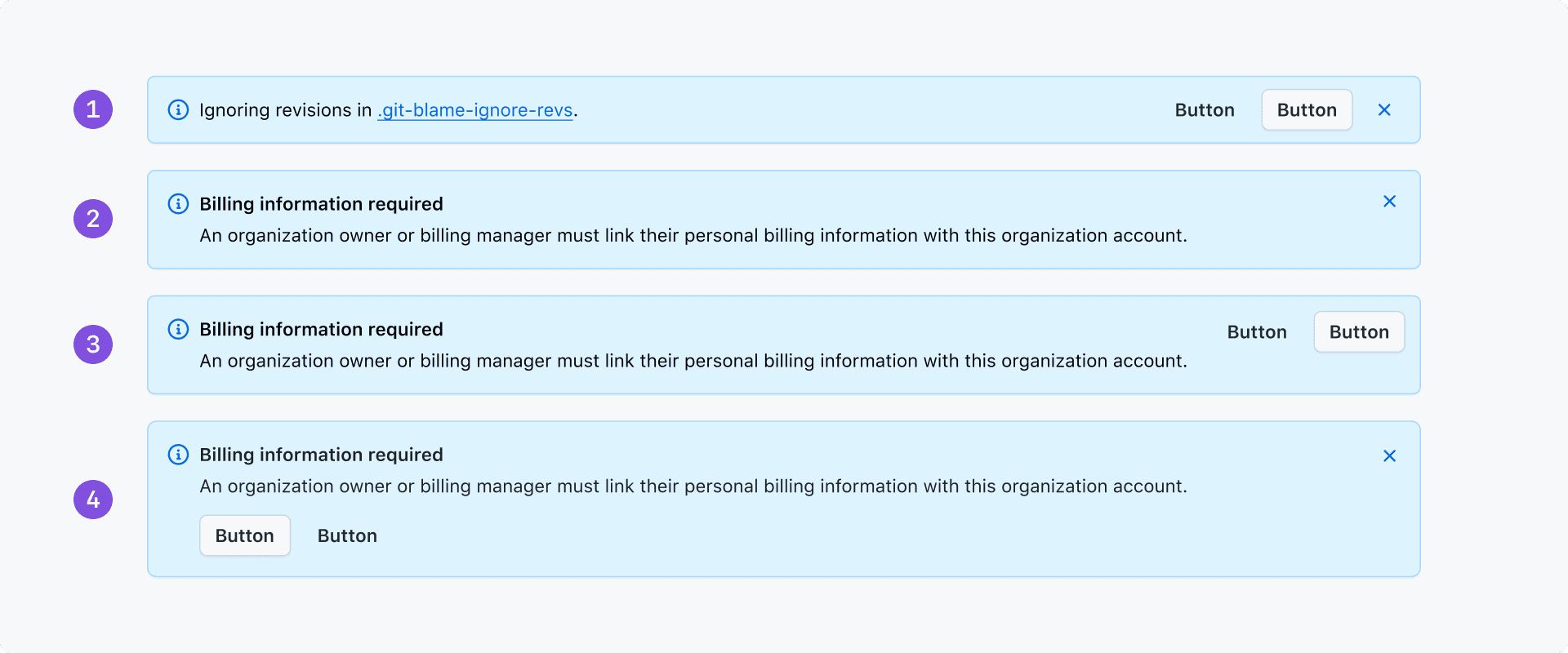 - Banners with a title but no dismiss button will have the actions aligned to the top right corner
