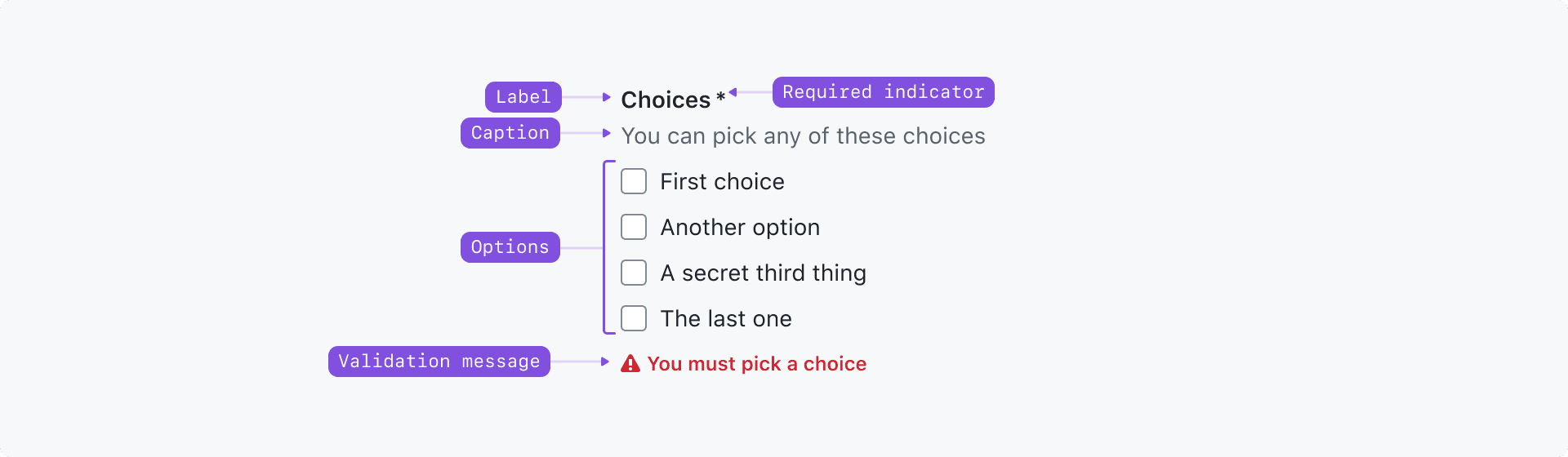 Validation message: A message explaining why the selection failed validation. See the form pattern documentation for more information on form validation patterns.