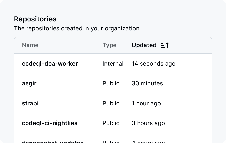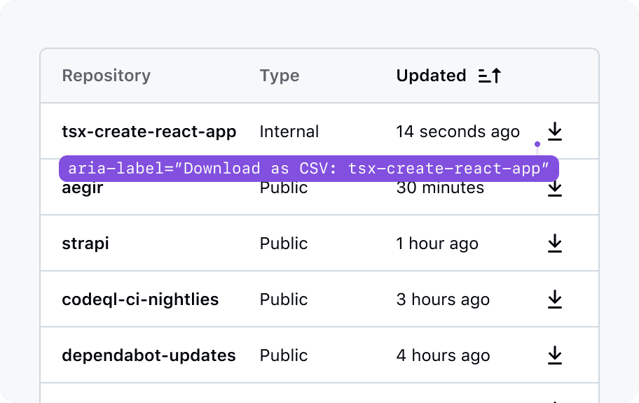 It is important that the accessible name is specific to each row. This is because people should hear context for the control they are interacting with As an example, if you provide a delete action for each row, make sure that the accessible name for that delete action includes some row specific information, like "Delete test repository" instead of just "Delete". This way, people will be able to understand the data to which the action relates to.