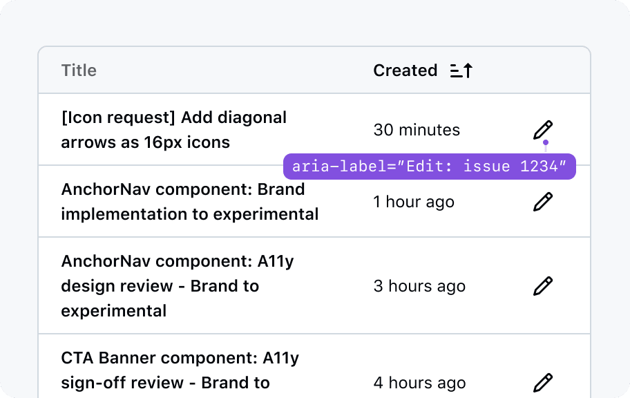 aria-describedbyattribute, to ensure that people using a screen reader can easily access additional context - When including actions for each row, the accessible name for the repeated controls must include sufficient context, so that people can easily determine which row/item the actions related to (e.g.)