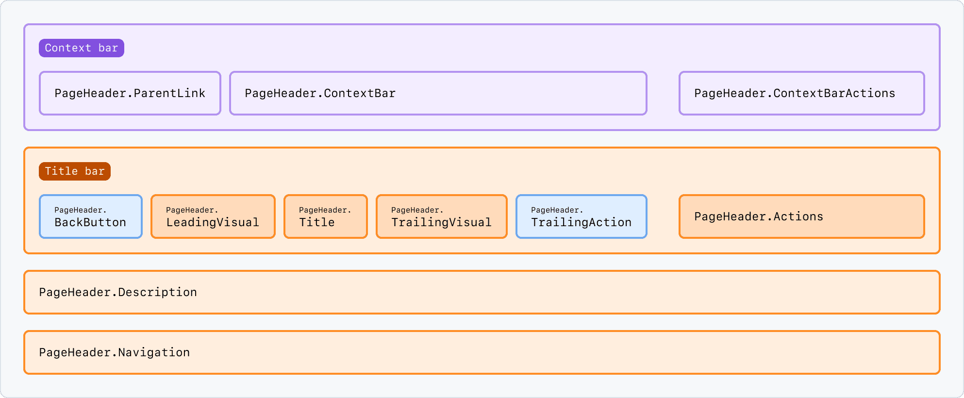 PageHeader can include a context bar, title bar, description, and contextual navigation (pertaining to the current page).