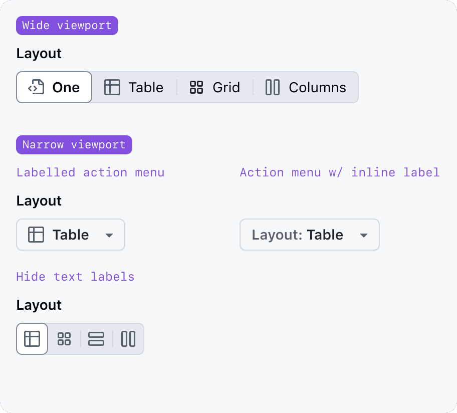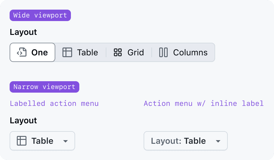 Aligns controls with adjacent elements and conserves vertical space while grouping related controls in a way that's easy to scan.