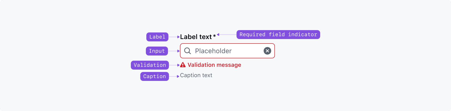 Edit in Figma- Label (required): Briefly describes the input's purpose. A label must exist for screen readers, even if it's visually hidden.